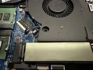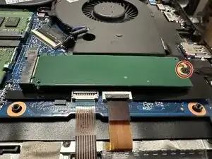 Отверните винт, фиксирующий SSD. Осторожно приподнимите SSD от теплоотводящей прокладки и извлеките его из разъёма.