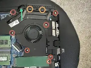 Отверните 10 показанных винтов. Два винта, отмеченные оранжевым, необходимо снять, чтобы снять вентиляционную панель с тыльной стороны ноутбука и получить доступ к скрытому винту, обозначенному зелёной стрелкой. Вентиляционная панель снимается лёгким натяжением от корпуса. После удаления всех винтов прижимная скоба над вентилятором снимется без затруднений.