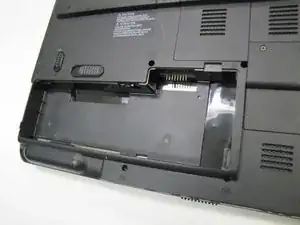 Сдвиньте фиксатор батареи в сторону замка. Батарея должна приподняться и выдвинуться из гнезда в ноутбуке.