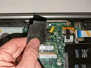 С помощью лопатки приподнимите штекер, соединяющий аккумулятор с материнской платой.