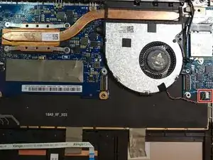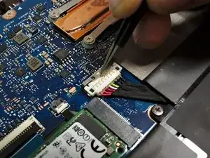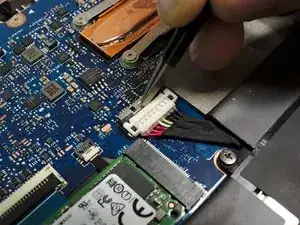Используйте пинцет с тупыми концами, чтобы вытащить разъём вентилятора из разъёма с маркировкой «FAN» на материнской плате справа.