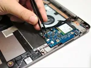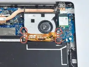 Открутите четыре винта длиной 2,8 мм, крепящих соединительную ленту материнской платы, с помощью биты крестовой отвертки №0.