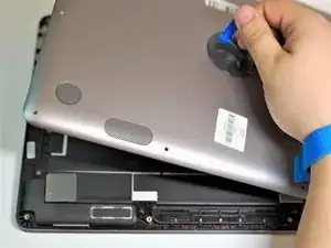 Используйте инструмент Джимми или лопатку, чтобы отсоединить две резиновые ножки, расположенные ближе всего к шарниру крышки.