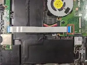 Подняв панель клавиатуры, отсоедините два ленточных кабеля от материнской платы, потянув за синие язычки на кабелях.