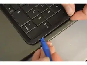 Используя пластиковый инструмент для вскрытия, начните поддевать в зазоре между экраном и клавиатурой.