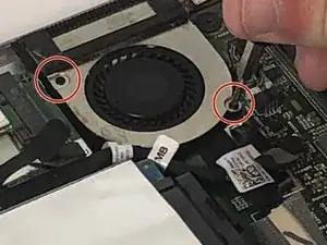 Используйте отвертку, чтобы снять два винта PH00 длиной 2,3 мм на вентиляторе процессора.