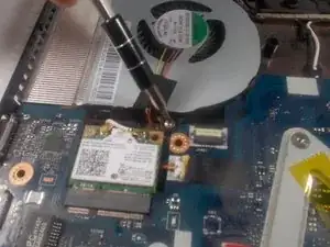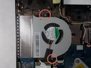 Используйте биту JIS #00, чтобы удалить отмеченные винты вокруг вентилятора процессора.