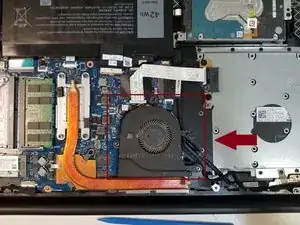 Удалите 3 винта, отмеченных красным, прежде чем аккуратно отключить черный кабель, отмеченный красными стрелками вдоль края вентилятора. При сборке помните, чтобы снова провести кабель через его крючки, чтобы он не мешал вентилятору или оптическому приводу.