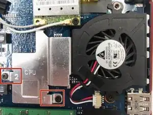 Используйте крестовую отвертку Phillips #00, чтобы выкрутить два монтажных винта 5 мм, обозначенные как 1 и 2, справа и слева на металлическом кожухе процессора.