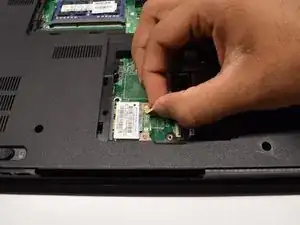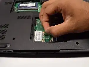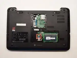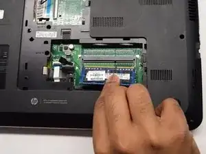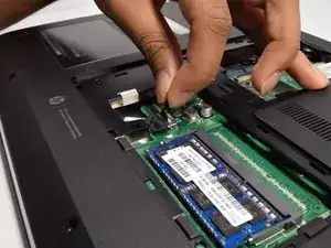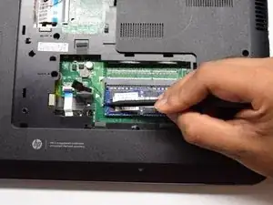 Используя лопатку, нажмите на серебристые фиксаторы, удерживающие оперативную память. ОЗУ выглядит как синяя прямоугольная плата размером примерно 1 x 2 дюйма. Услышится лёгкий щелчок, и планка ОЗУ должна выскочить. Затем вы можете вынуть её из ноутбука.