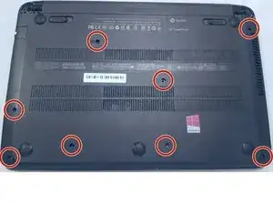 Используя крестовую отвёртку Phillips #0, выкрутите все девять винтов на нижней панели компьютера.