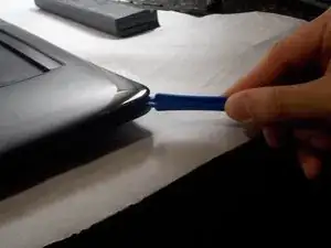 Используйте лопатку, чтобы поддеть угол тонкой пластикового планки, расположенной над клавиатурой.