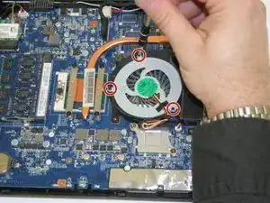 С помощью отвёртки Phillips #00 отврутите три винта 3,0 мм, крепящие вентилятор к узлу радиатора.
