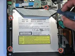 Удалите винт, крепящий кожух оптического привода к плате логики.