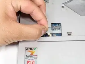 Найдите ленточный кабель, соединяющий клавиатуру с ноутбуком. Обратите внимание на чёрные защёлки по обеим сторонам кабеля у места подключения к ноутбуку.