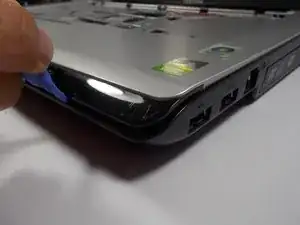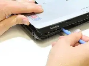 Используя пластиковый инструмент для открывания, вставьте его в зазор по периметру ноутбука и отделите серебристую рамку от чёрного дна.