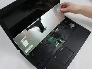 Когда клавиатура отщёлкнется, используйте лопатку, чтобы отжать ленту или фиксатор, который прикрепляет заднюю часть клавиатуры к внутренней основе ноутбука.