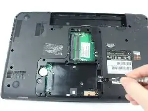 Пока правая рука всё ещё нажимает, извлеките батарею левой рукой.
