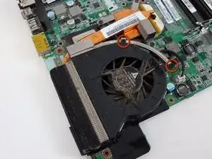 Найдите 3 отмеченных фиксатора, удерживающих вентилятор на материнской плате.