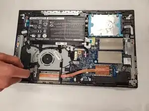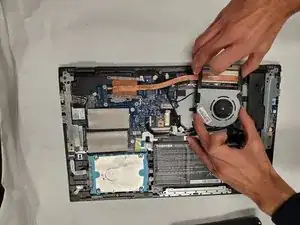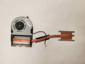 Удалите небольшой бежевый разъем, фиксирующий вентилятор к ноутбуку, и снимите сборку вентилятора и радиатора с ноутбука.