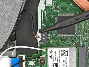 С помощью кончика лопатки нажмите по обе стороны разъёма кабеля батареи, пока он не выйдет из посадочного гнезда.