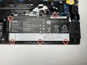 Используя крестовую отвёртку Phillips #0, открутите пять винтов длиной 3.5 мм, фиксирующих батарею.