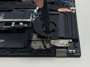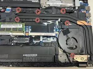 Отверткой Phillips #00 ослабьте семь удерживающих винтов 2,5 мм, крепящих узел вентилятора к материнской плате.