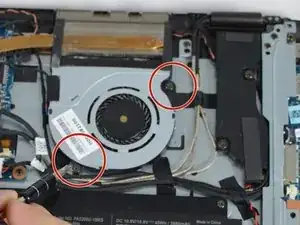Открутите два винта JIS #1 длиной 7 мм, которые крепят вентилятор к ноутбуку.