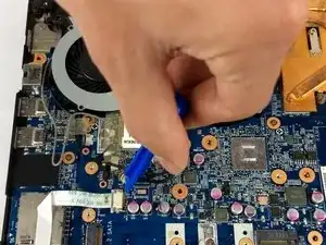 Чтобы снять вентилятор видеокарты, необходимо отсоединить два кабеля вентилятора видеокарты. Используйте пластиковый инструмент для вскрытия, чтобы вынуть кабель.