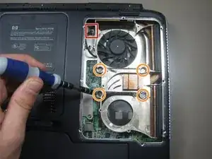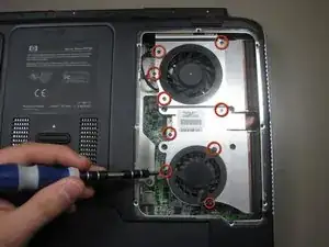Удалите девять винтов Phillips с пластины, закрывающей вентиляторы.