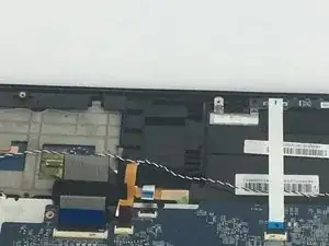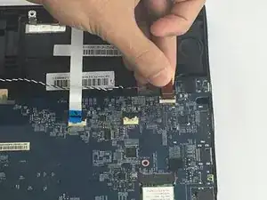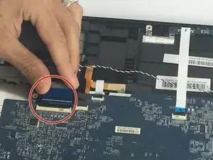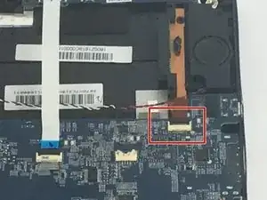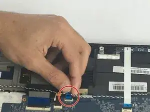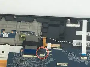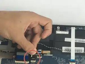 Отсоедините коричневый провод, расположенный рядом с предыдущим. Осторожно приподнимите, чтобы разблокировать чёрную защёлку, соединяющую его с материнской платой.
