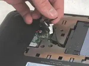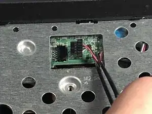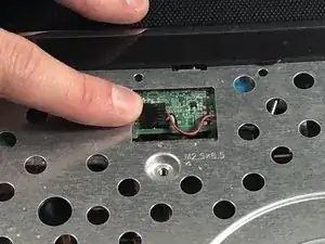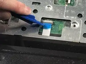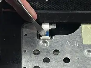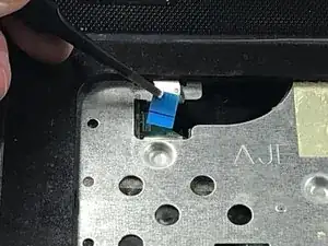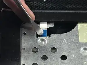 Пинцетом или пластиковым инструментом для вскрытия отключите кабель динамика от чёрного разъёма, расположенного рядом с правой стороной ноутбука.