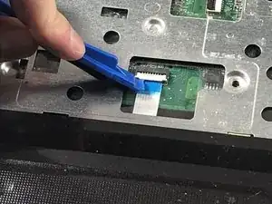 С помощью лопатки откиньте фиксатор ленточного кабеля кнопки питания.