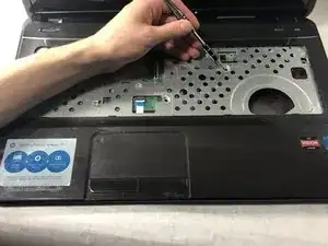 Пинцетом выньте ленточный кабель трекпада из разъёма на материнской плате.
