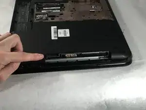 Поместите палец на ползунок фиксатора батареи и нажмите в сторону центра ноутбука, чтобы разблокировать батарею.