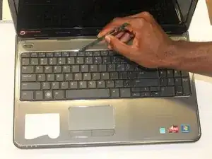 Вставьте металлическую линейку длиной 15 см или другой плоский предмет в отверстия в верхнем левом, верхнем среднем и верхнем правом углах клавиатуры, чтобы освободить клавиатуру от компьютера.