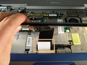 Вытяните белую защёлку под клавиатурой вверх, пока она не выйдет из разъёма.