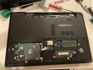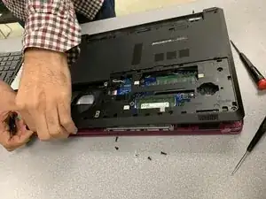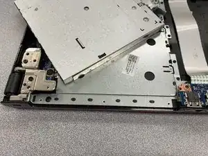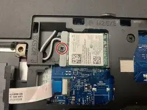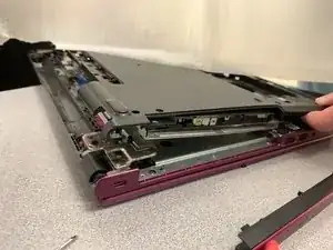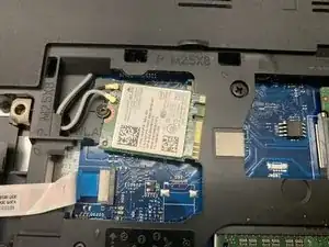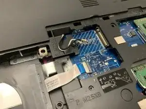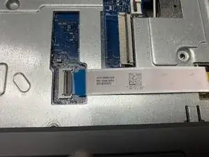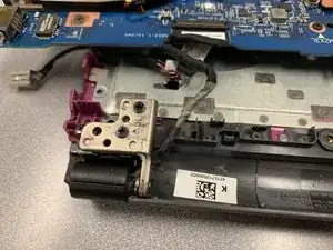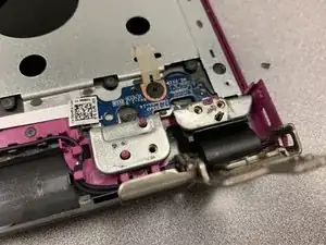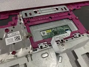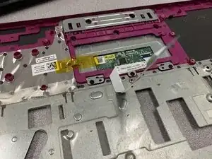 Отвинтите плату рядом с левой петлёй при взгляде на ноутбук спереди. (Она подключена к трекпаду)