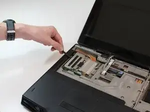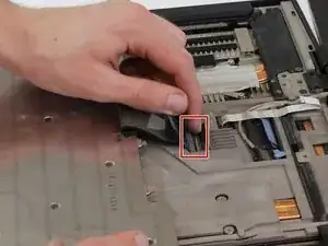 Отверните два фиксатора, соединяющие широкий кабель клавиатуры и тонкий кабель подсветки с ноутбуком.