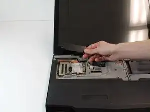 Для освобождения центральной панели может потребоваться значительное усилие. Не поднимайте панель сразу же после поддевания — от ноутбука идёт кабель, соединяющий панель с платой.