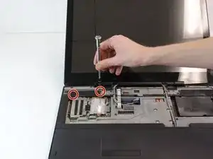 Снимите два винта 2 мм Phillips #0 из выемок слева и справа от вентилятора процессора.