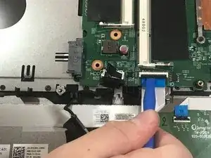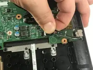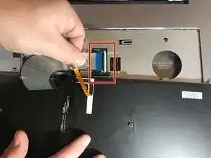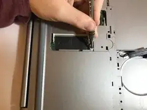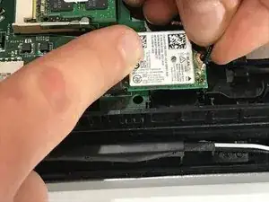 Беспроводная карта находится рядом с левым шарниром ноутбука и имеет два небольших разъема. Аккуратно поднимите левый черный разъем с платы, а затем извлеките плату из ноутбука.