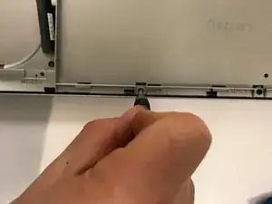 Удалите винт PH 1 длиной 8 мм, который держит пластиковую крышку над аккумулятором.