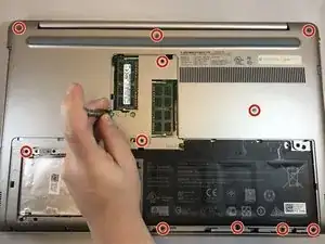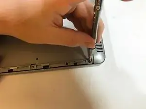 Закройте ноутбук и переверните его, обнажая нижнюю поверхность. Используя металлический инструмент и синий открывающий инструмент, аккуратно подденьте нижнюю крышку. Повторите этот процесс по всему периметру ноутбука.