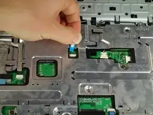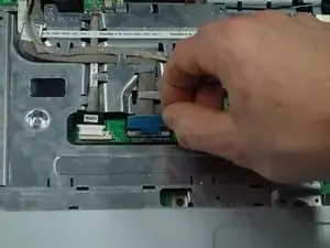 Поднимите маленькую защёлку пальцем и вытяните синюю ленту из разъёма.