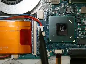 Используйте нейлоновую лопатку, чтобы отсоединить проводной разъём (красный/синий) от материнской платы.