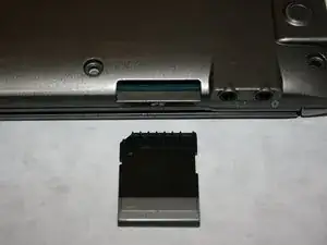 Подденьте заднюю крышку, начиная с кромки, противоположной слоту для SD-карты. Поднимайте слева направо и продолжайте поднимать под этим углом, пока крышка полностью не отпадёт от ноутбука.
