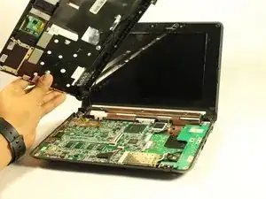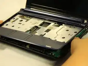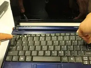 Начните с верхнего правого угла и используйте лопатку, чтобы отжать фиксатор от клавиатуры.