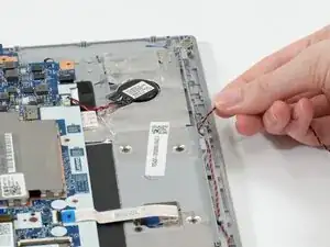 С помощью тканевой петли отсоедините кабели аккумулятора от разъёма внутри устройства.