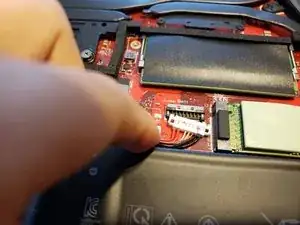 Аккуратно отожмите металлическую клипсу, удерживающую разъём аккумулятора, назад с помощью лопатки или пальцев.
